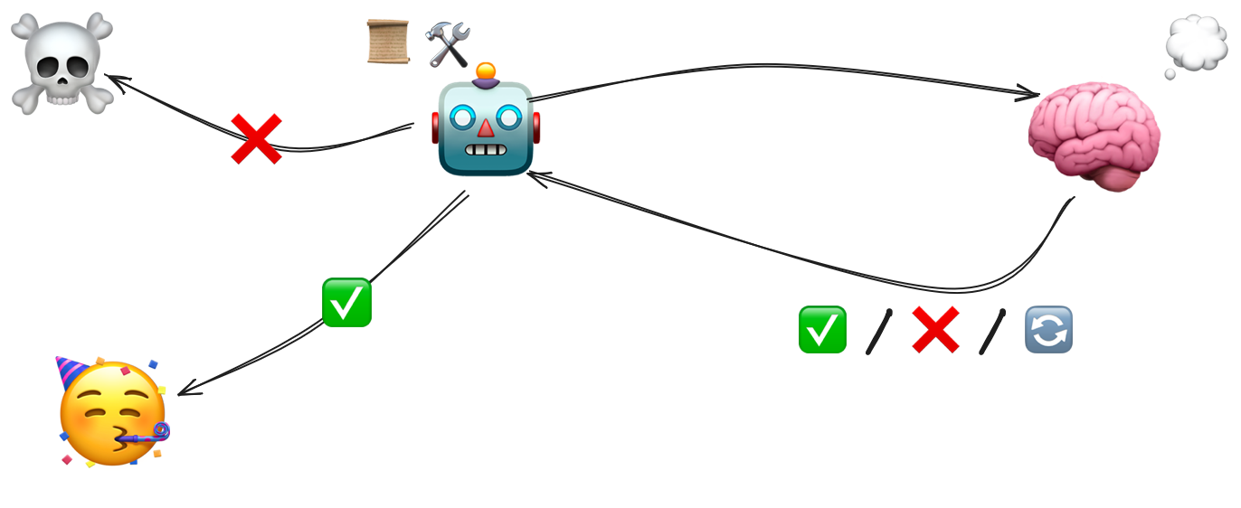 Ce serait beaucoup trop simple et pas assez waouh dans le monde de l'IA 😅. Si vous lisez 2-3 autres blogs, vous tomberez certainement sur le pattern ReAct pour les agents. ReAct pour Reasoning and Acting. L'objectif va être d'introduire une boucle de feedback dans la relation entre votre agent et son LLM. Ici on va vouloir maximiser la qualité de la réponse demandée par l'agent.