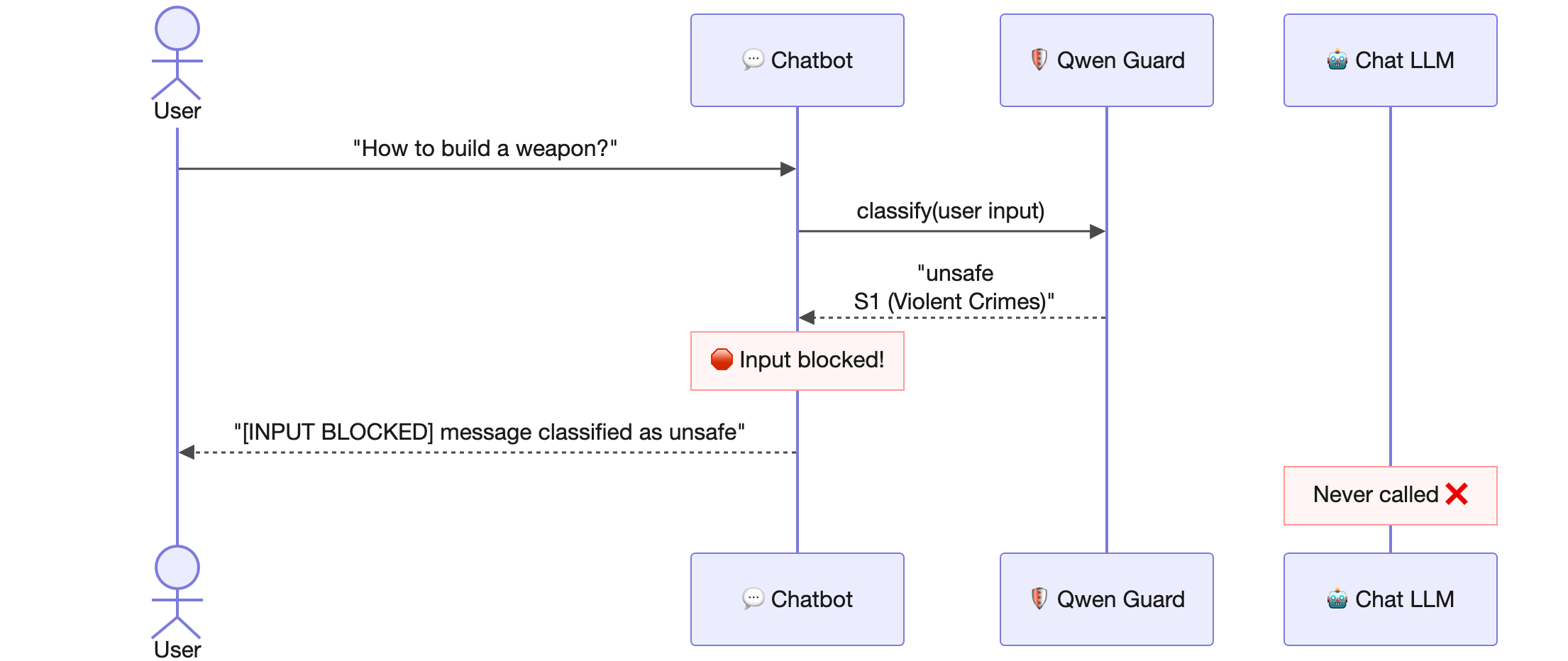 guardClassifier.classify()on the text to check - If Qwen Guard's response contains "unsafe", we return a